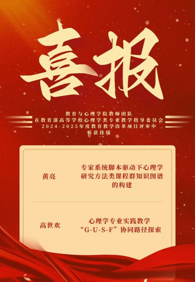 近日,教育部高等学校心理学类专业教学指导委员会公布了2024-2025年度教育教学改革项目的立项名单,我院黄亮老师的“专家系统脚本驱动下心理学研究方法类课程群知识图谱的构建”项目(课程建设类)和高世欢老师的“心理学专...