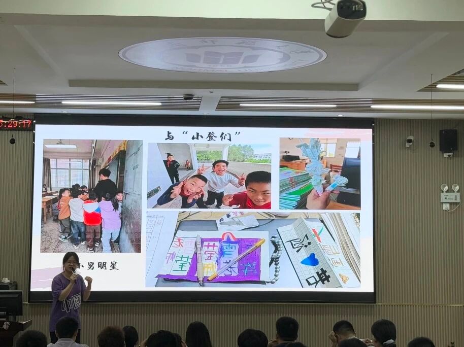 2022级的七支实习队代表依次上台作经验分享。队员们借助丰富的图片与视频资料,生动讲述了实习期间的趣事与挑战,真诚分享了在课堂教学、班级管理、师生互动等方面的成长与感悟。