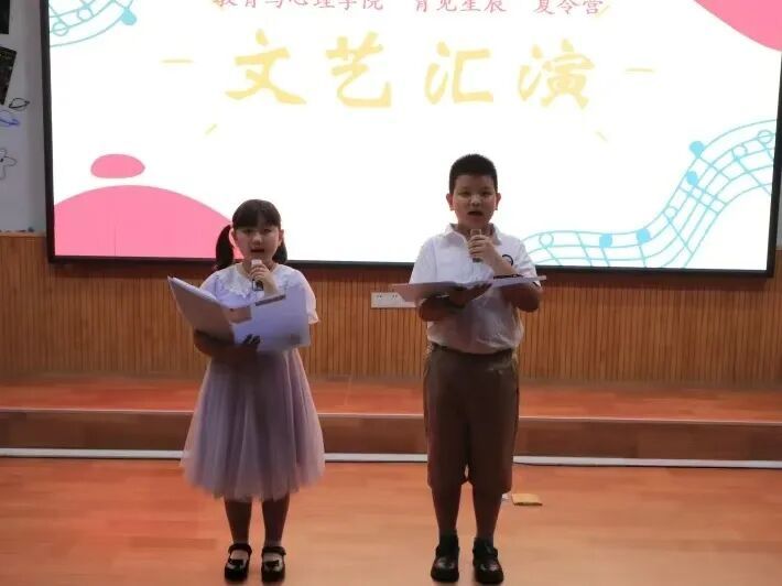 在实践团成员与孩子们的共同策划筹备下,夏令营迎来了收官之际的视听盛宴——“育见星辰” 社会实践成果汇演。实践团与孩子们携手呈现了一系列节目:闽南童谣演唱、心理剧表演、诗歌朗诵、歌曲演唱等,每一个节目都镌刻着孩子们的蜕变轨迹与闪光瞬间。除了舞台表演,汇演现场还陈列着孩子们在活动中制作的手工品,件件作品都凝结着他们的创意巧思与专注心血。家长们纷纷表示,这场夏令营不仅提升了孩子的表现力与社交能力,更让他们直观见证了孩子的成长蜕变。