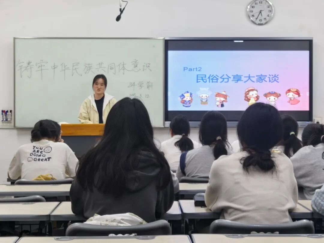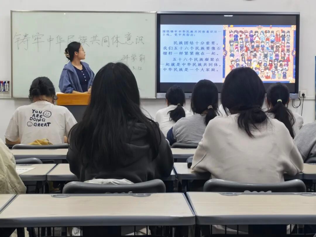 3月12日,2024级学前教育团支部于逸夫楼301开展主题团日活动。活动以民族文化体验为主线,通过民族服饰展示、民俗知识竞答等互动环节,引导同学深入感悟“多元一体”的中华文化脉络。此次活动不仅深化了支部成员对各民族传统习俗的认知,更引领同学们深刻认识各民族共同缔造中华文明的历史进程,在强化民族文化认同的同时,进一步筑牢“中华民族一家亲”的思想根基,切实增强维护国家统一,促进民族团结的时代责任感,激发同学们投身民族复兴伟业的历史使命感。