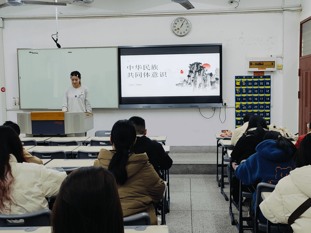 3月7日,2024级学硕研究生团支部于逸夫楼301开展主题团日活动。团支书通过播放民族团结主题视频,多维度呈现了我国各民族在经济共荣、文化互鉴、社会交融等维度的协同发展图景,使在场团员青年深切感悟到中华民族大家庭的温暖与团结,为本次活动奠定了良好的情感基调。在主题演讲环节,多名团员青年联系生活实际,深情讲述了与其他民族同窗交往中的真实经历与动人故事。本次活动通过具象化的个体叙事与情感共鸣,不仅深化了全体成员对中华民族共同体理念的认知层次,更实现了思想境界的升华与实践行动的同频共振。