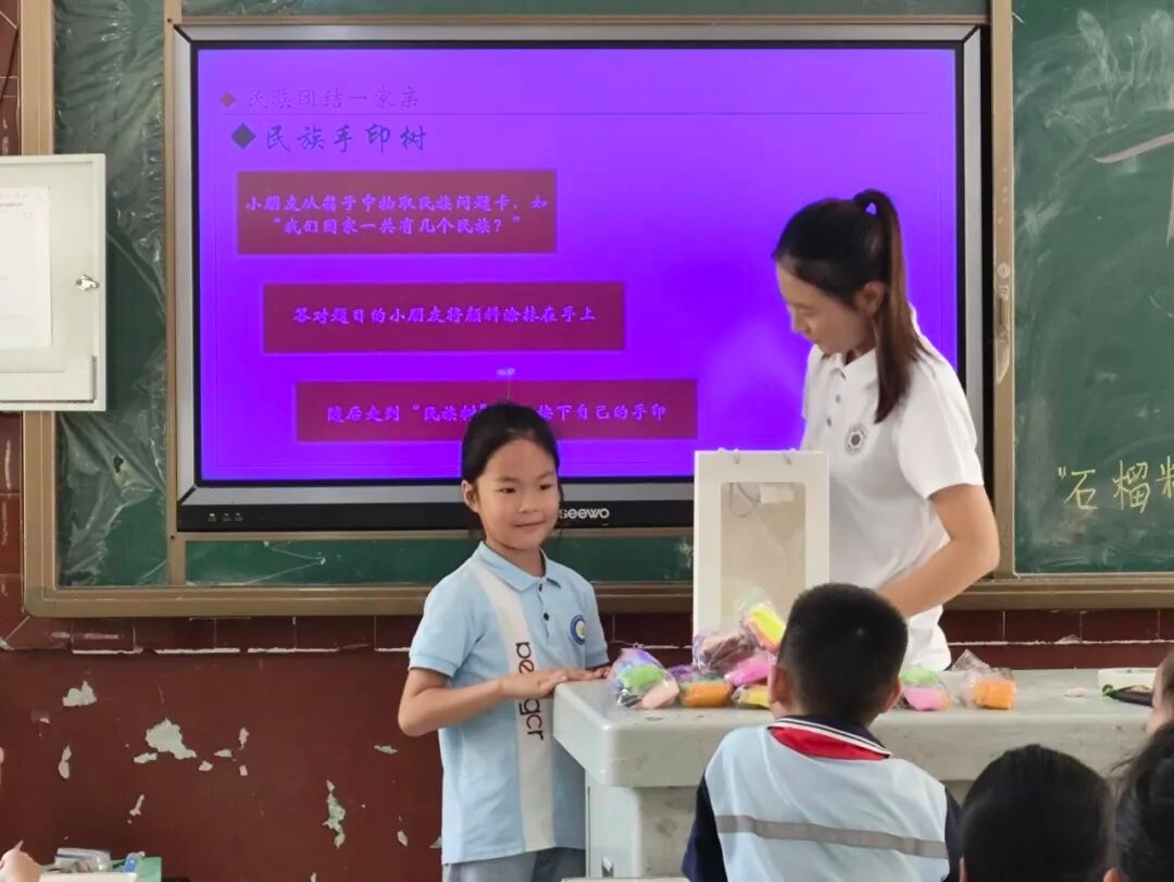 实践队将实践所见和理论所学进行融合形成主题宣讲课程,为隆教畲族中心小学的学生们讲述畲乡文化根源和蓝氏三杰等畲族先辈平台、治台、筹台的光辉事迹,让民族团结情谊在畲乡石榴籽“幼苗”心间扎根生长;实践队还依托专业优势开展“心有千千结”“民族手印树”“蓝土创想营”等团辅、手工课程,让畲族学子从团辅课程体验、黏土动手实践的过程中深入理解民族团结一家亲的重要性。