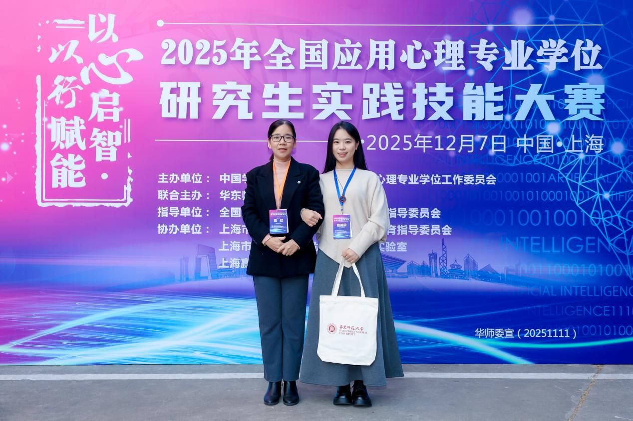 近日,由中国学位与研究生教育学会应用心理专业学位工作委员会主办,全国应用心理专业学位研究生教育指导委员会提供指导,并由华东师范大学承办的“2025年全国应用心理专业学位研究生实践技能大赛”总决赛于12月6日至7日在华东师范大学举行。本比赛自2025年10月启动,设有心理咨询/心理治疗面谈技能、应用心理案例开发、心理科普作品、应用心理方案/产品设计四个赛道,吸引了全国146所院校,641个作品参赛。其中,心理咨询/心理治疗面谈技能赛道共提交138个作品,最终入围决赛的作品为43个(前30%),入围选手参与现场决赛。经过多轮激烈角逐,我院应用心理专业硕士研究生熊雨欣(指导教师:陈虹)荣获心理咨询/心理治疗面谈技能比赛二等奖,曾泓嘉(指导教师:林美芳)荣获应用心理案例开发比赛三等奖。