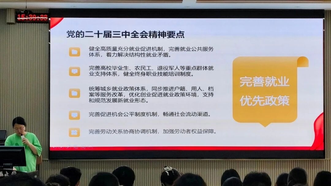在就业规划方面,徐欣结合党的二十届三中全会精神要点及习近平总书记的重要讲话,强调青年人应将小我融入祖国与人民的大我,与时代同步伐、与人民共命运,将个人成长融入国家发展。同时,她深入解读国家宏观政策,剖析行业现状,帮助同学们开启认知新兴职业的大门。